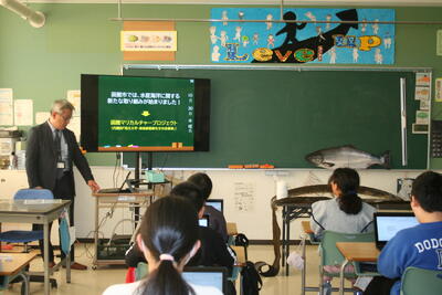 函館国際水産・海洋都市推進機構 事務局長の川村 真一さんを講師に迎え、函館市の水産業について出前授業を行なっていただきました。