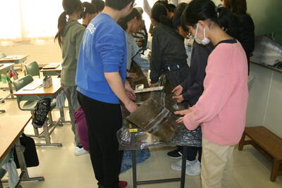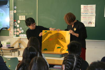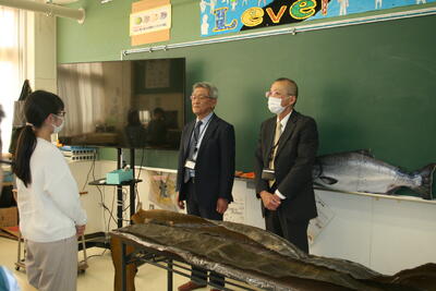 青森市とは縄文時代からの津軽海峡を挟んだ歴史的交流のこと、函館市の魚「イカ」に関すること、育てる漁業コンブやキングサーモンに関することなど、クイズを交えながらわかりやすく教えていただきました。「函館市はコンブの生産量日本一である」と教えていただいたときには子どもたちから歓声があがりました。